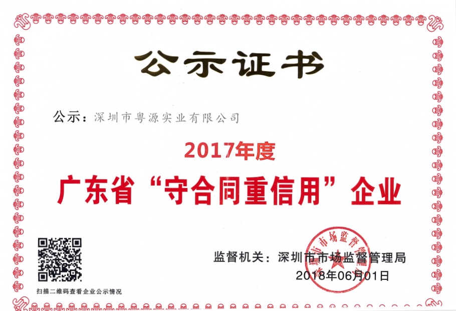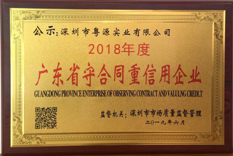 - 粵源實(shí)業(yè)再次榮獲2018年度廣東省“守合同重信用”企業(yè)