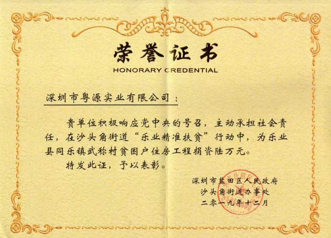 - 粵源實(shí)業(yè)榮獲“精準(zhǔn)扶貧愛(ài)心企業(yè)”稱(chēng)號(hào)